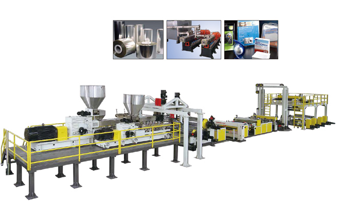 Changzhou JWELL develops the parallel twin screw extrusion line for PET sheet, this line equipped with degassing system, and no need drying and crystallizing unit. The extrusion line has the properties of low energy comsuption, simple production process and easy maintenance. The segmented screw structure can reduce the viscosity loss of PET resin, the symmetrical and thin-wall calender roller highten the cooling effect and improve the capactity and sheet quality. Multi components dosing feeder can control the percentage of virgin material, recycling material and master batch precisely, the sheet is widely used for
