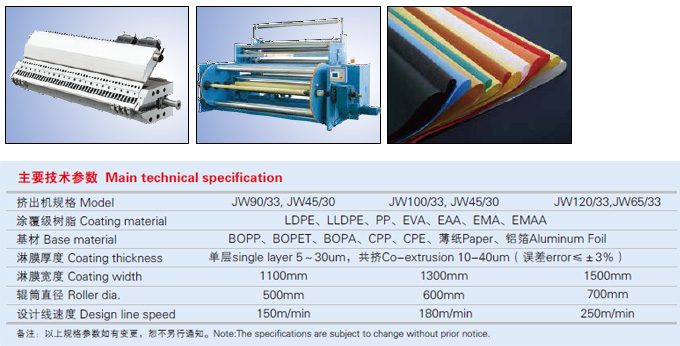 JWELL coating film production lines, including milk, liquid asepsis packing film co-extrusion line, high-class digital printing paper extrusion and laminating composite production line,toothpaste sheet extrusion line, pre-coating film and card film extrusion and laminating composite production line, candy and food high barrier packaging material extrusion line, madicine barrier packaging sheet extrusion line, insant noodle coating film production line, papercups and paper food containers drench film machine, single or double sides coating film, single, double or three layers co-extrusion lines.