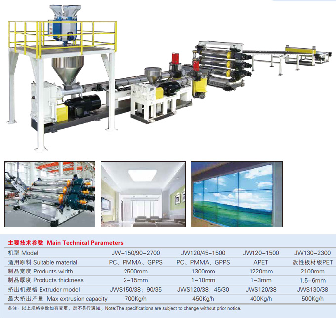Application of product: common PMMA plate is mainly used in the field of advertisement, decoration, art ware, escutcheon and specimen etc; the electroplated plate is used for plastic mirror; Light panel is used for ultra light box, flat panel display lamp of LED,poster stand and advertising decoration etc. LCD panel can be used for the display of computer and television. JWELL'S plate extrusion line is suitable for producing the PMMA or PC diffusion plate.